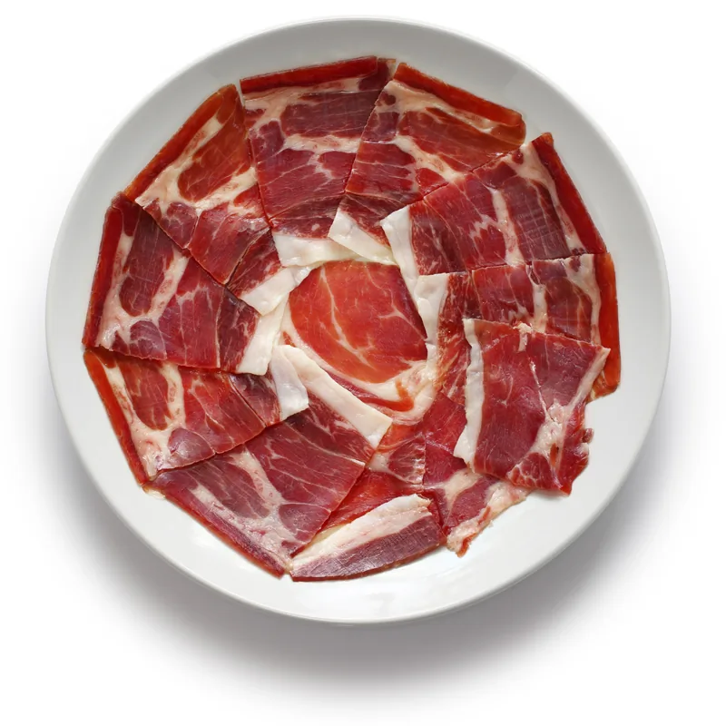 Centro de jamón ibérico de cebo de campo loncheado a cuchillo. Selección de las mejores lonchas de la zona central de la pieza, donde el jamón alcanza su máxima expresión. Curación mínima de 24+ meses. Textura sedosa con el sabor inconfundible del ibérico.
