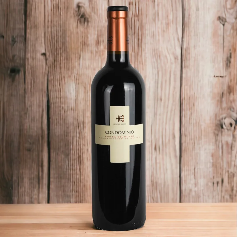 Vino tinto de Bodegas Condominio, D.O. Ribera del Duero. Elaborado con Tempranillo 100%. Color cereza con ribetes violáceos. Aromas de fruta roja, tostados suaves y especias. Boca equilibrada con taninos amables y final agradable.