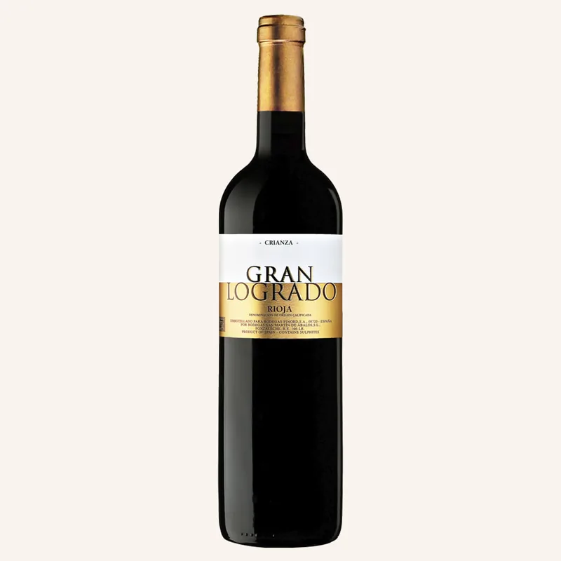 Vino tinto de Bodegas Gran Logrado, D.O.Ca. Rioja. Elaborado con Tempranillo 85%, Garnacha 15%. Color cereza con ribetes granate. Aromas de fruta madura, vainilla, especias y notas balsámicas. Boca suave, redonda, con taninos integrados y buen recorrido.