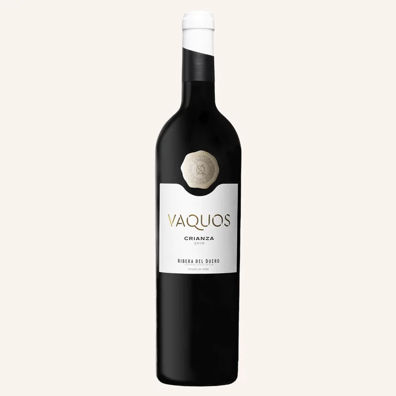 Vino tinto de Bodegas Vaquos, D.O. Ribera del Duero. Elaborado con Tempranillo 100%. Color cereza profundo con ribetes granate. Nariz compleja de fruta madura, cuero, tabaco y especias dulces. Boca estructurada, elegante, con taninos pulidos y final largo.