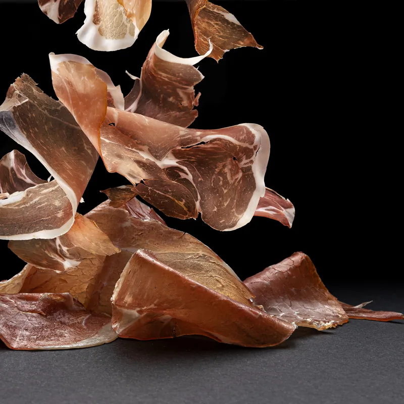 Virutas de jamón ibérico, perfectas para enriquecer platos de pasta, ensaladas, huevos rotos o croquetas. Todo el sabor del jamón ibérico en un formato práctico y versátil.